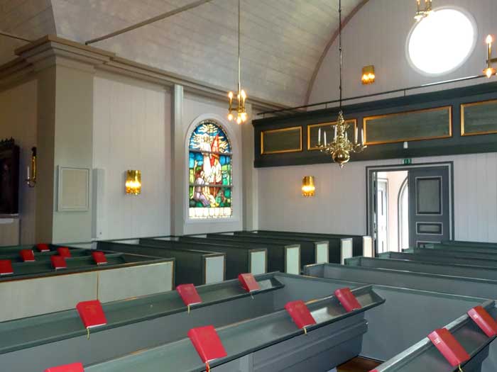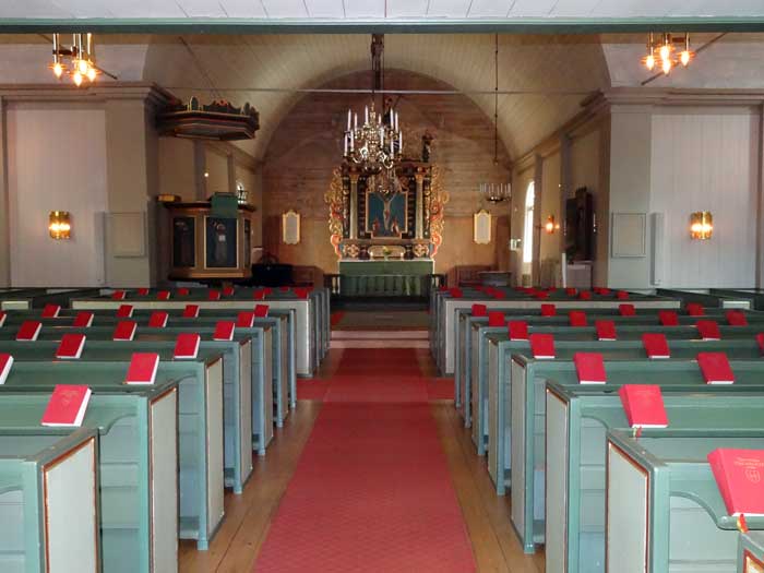 På väggen anar man väggmålningarna från 1400-talet.