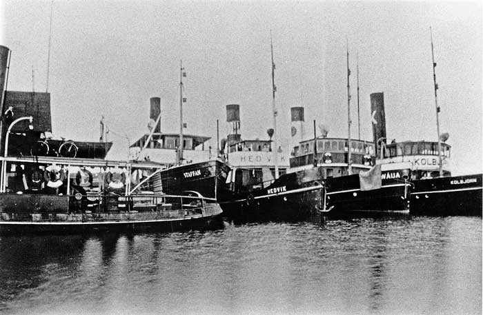 Okänd, STAFFAN, HEDVIK, WÄIJA, samt KOLBJÖRN i Furuögrunds hamn, cirka 1950