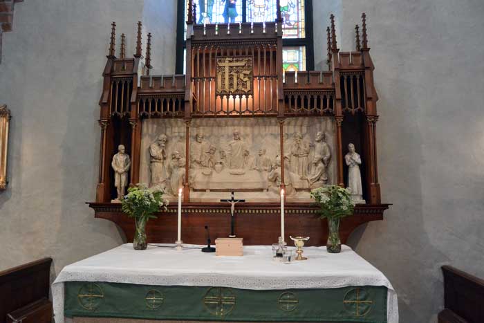 Reliefbilden av skulptören Harald Sörensen Ringi, föreställer nattvardens instiftande. Figuren till vänster föreställer Erik Gustaf Geijer och figuren till höger är en replik av Carl Eldhs "Mor".