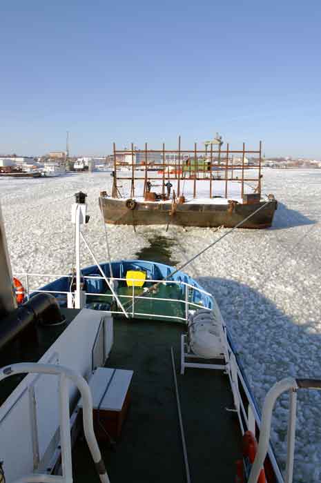 Vi skulle hjälpa Miltzis ut till öppet vatten som är strax utanför Blå Jungfrun. Issituationen är besvärlig utanför Oskarshamn med den ostliga vinden som varit, och som har pressat ihop den till en kletig massa. Herbert skulle koppla Miltzis pråm och dra igenom isen, sen skulle Miltzis koppla i iskanten.