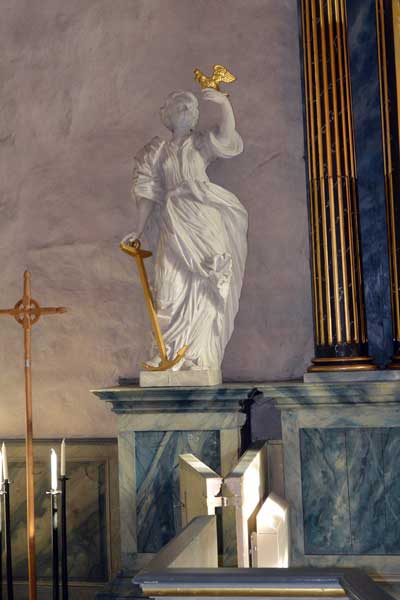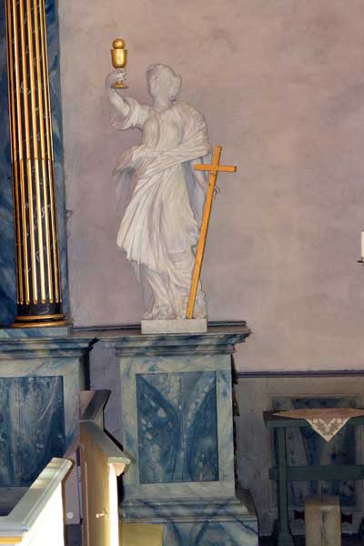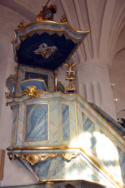 Predikstolen dateras till 1753, är tillverkad i Sigtuna.