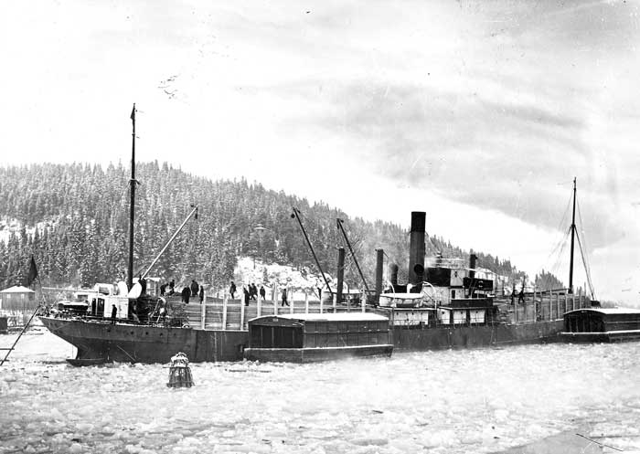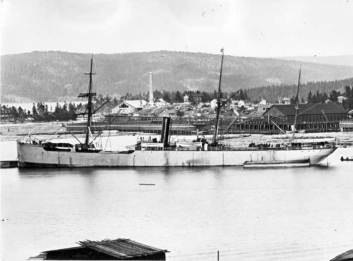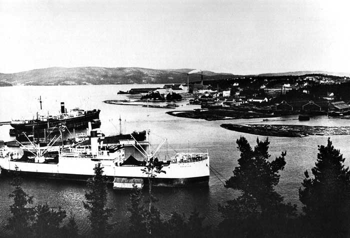 Kramfors Västra såg med lastande fartyg. Till vänster lilla ROBERT och till höger den lite större DOVRE.
