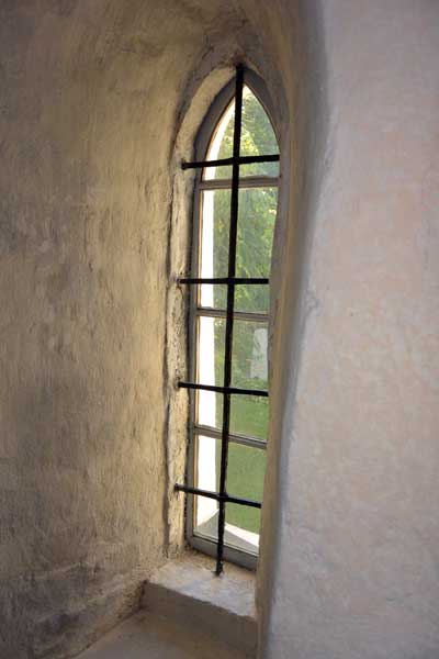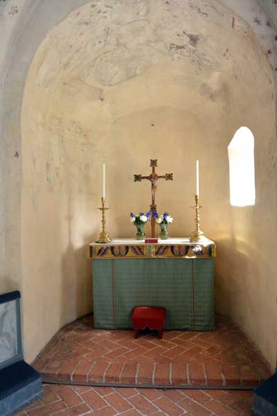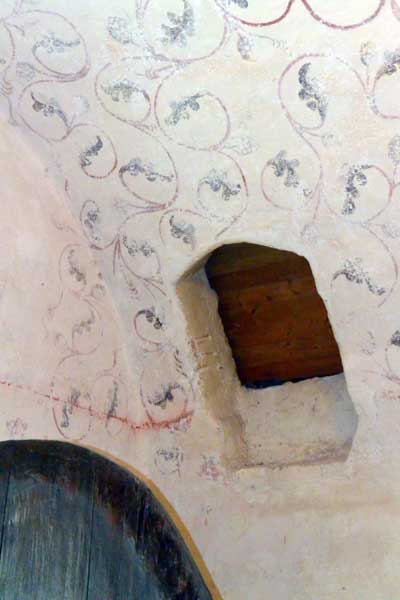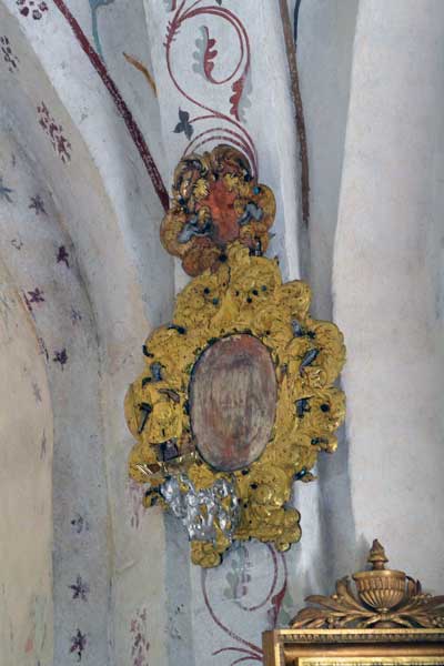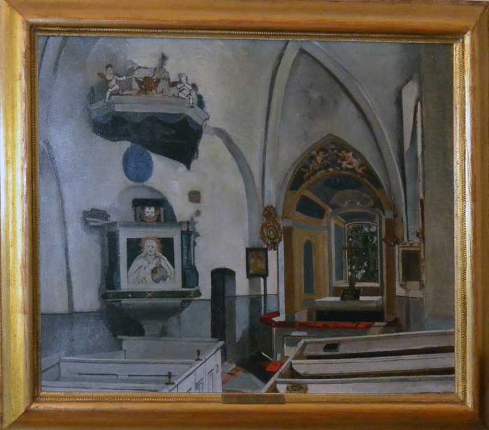 Tavla som hänger i sakristian visar den fönsteröppning i absiden som togs upp 1802 (och murades igen 1922). Noterbart är att väggarna var vitkalkade.