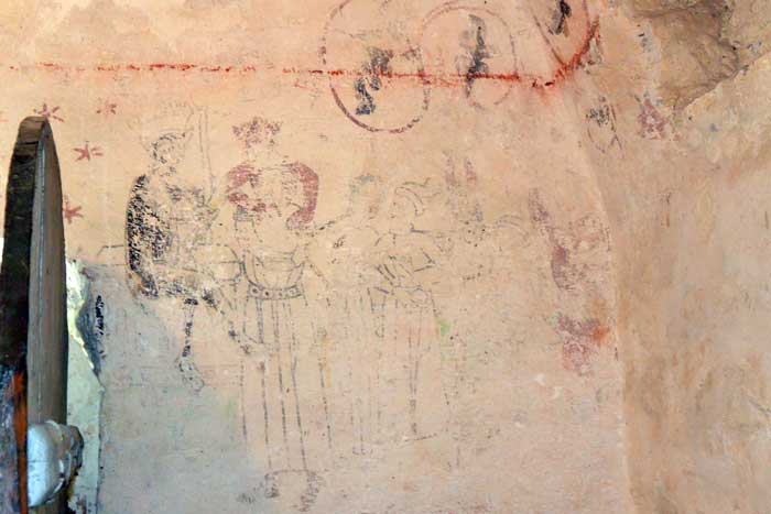 Bredvid ovanstående målning finns denna från 1400-talet av tre heliga konungar (de tre vise männen)