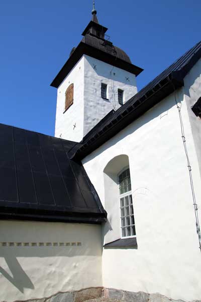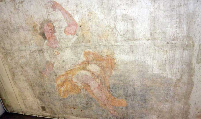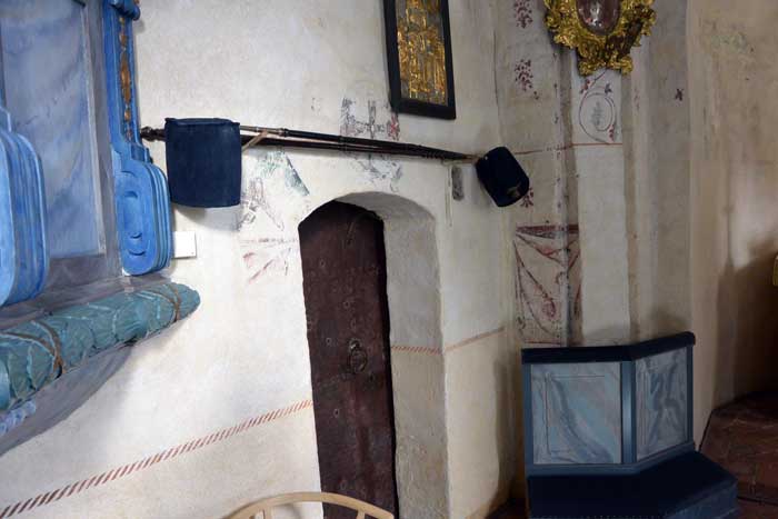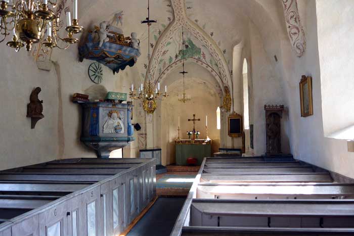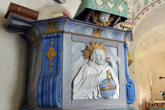 Predikstolen är från mitten av 1700-talet. Vid den tiden överkalkades alla målningar.