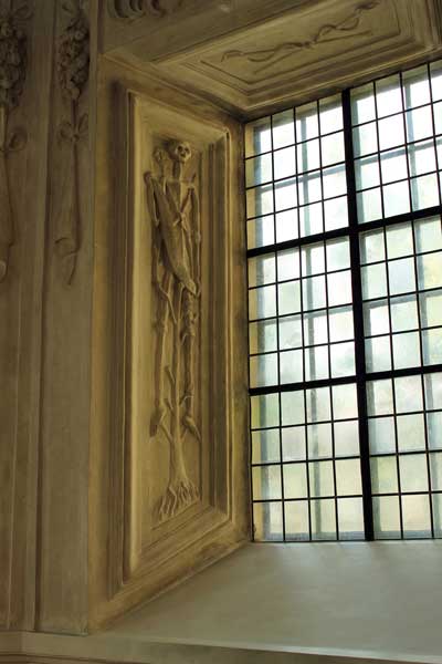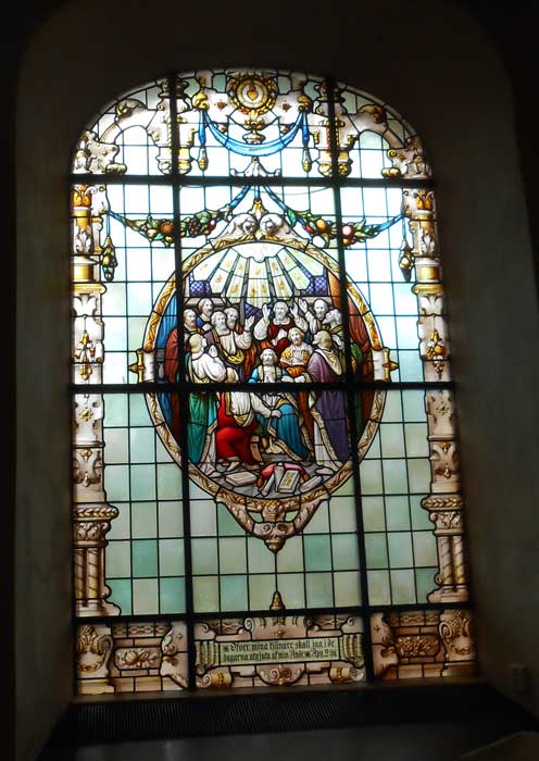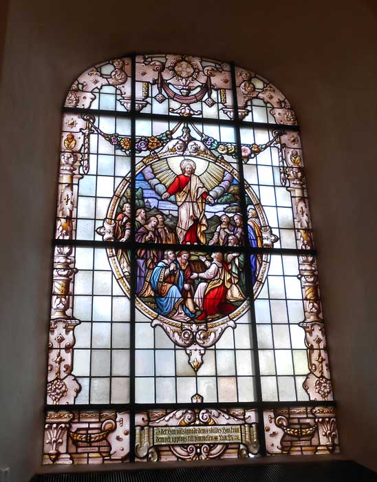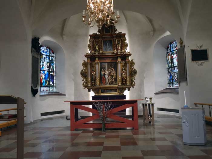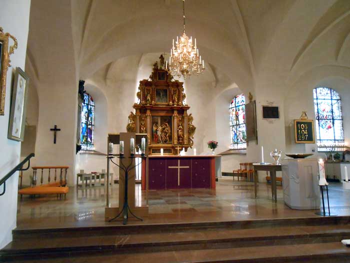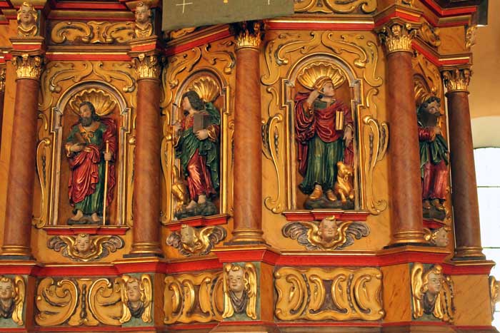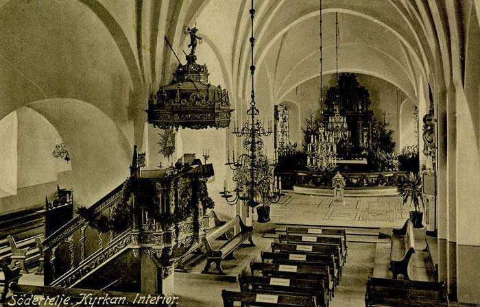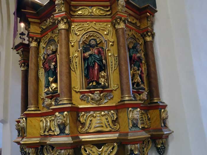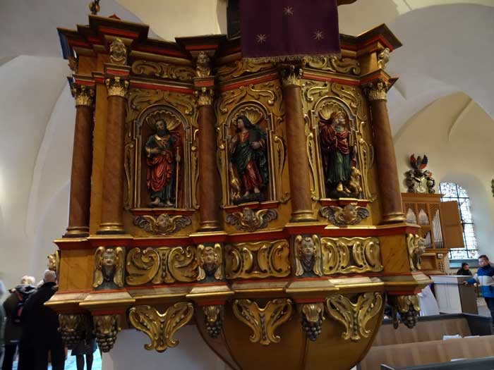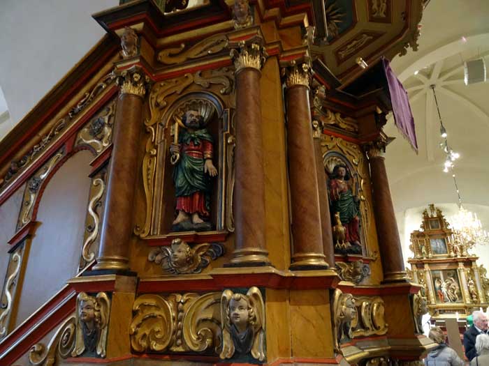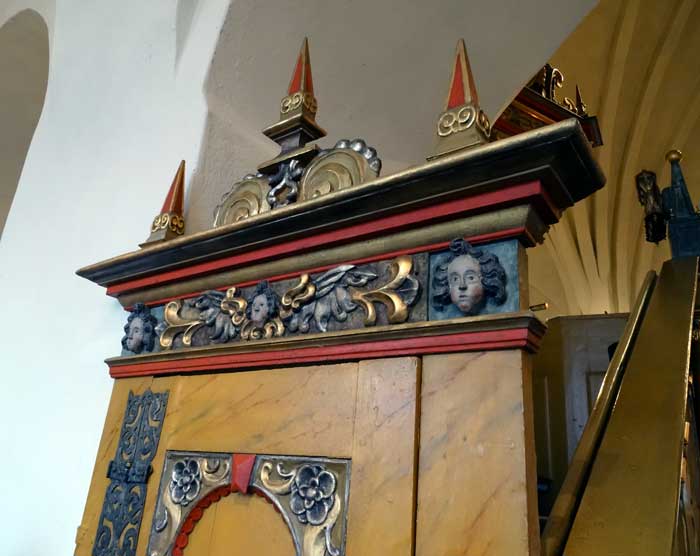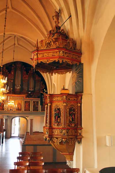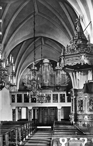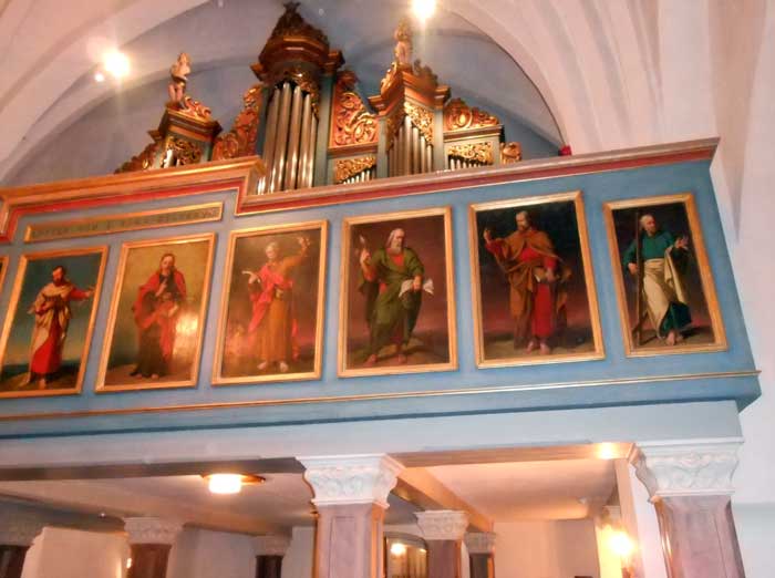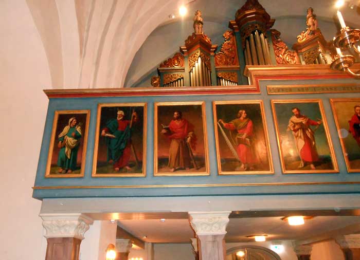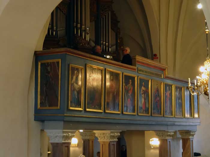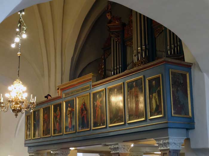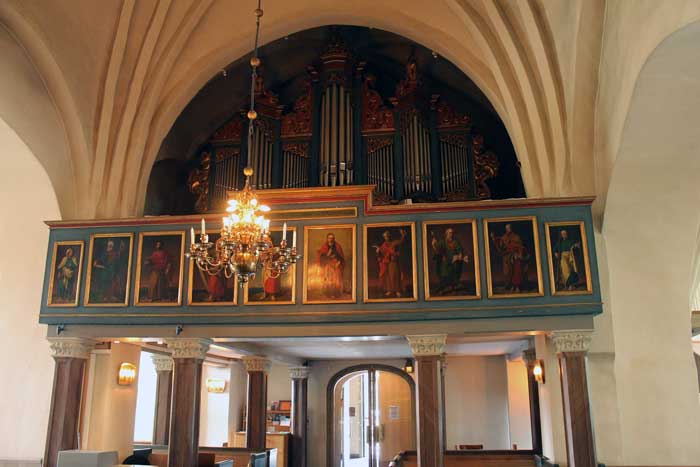 Orgelläktaren pryds av 10 apostlar. Orgelfasaden tillkom 1863 i imiterad 1600-talsstil, ritad av J W Söderlund.