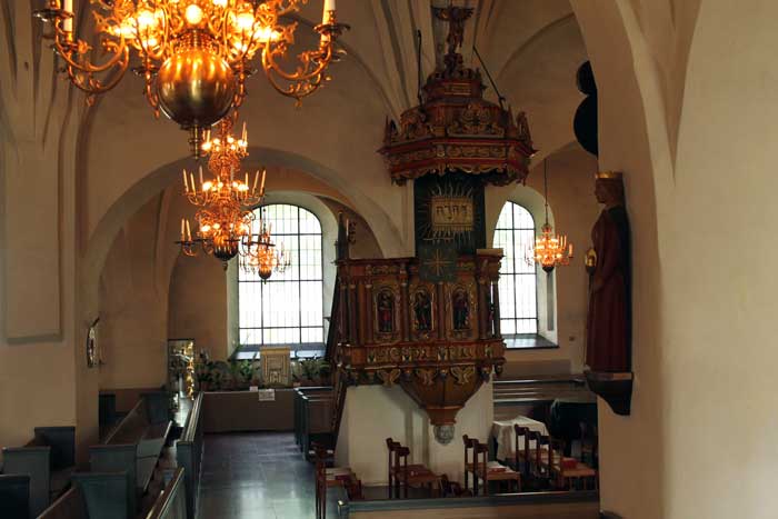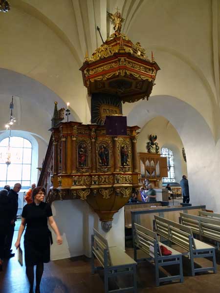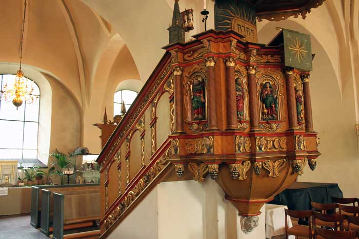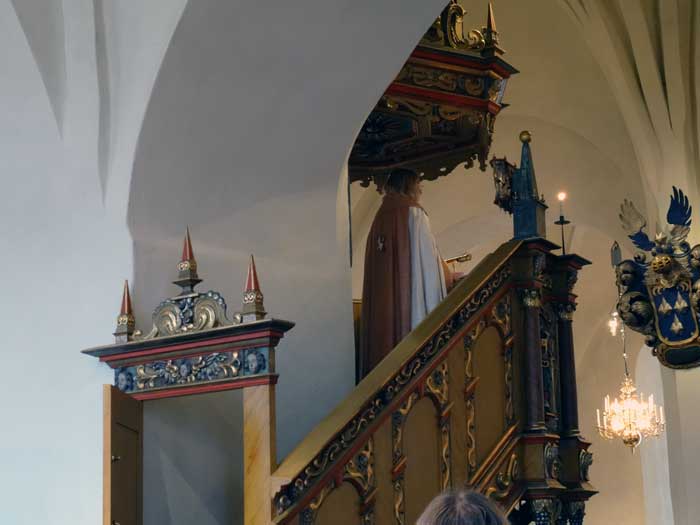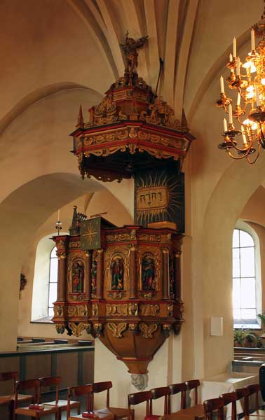 Predikstolen är liksom altaruppsatsen skänkt av generaltullförvaltaren Wilhelm Drakenhielm 1657 eller 1658. Priset för den var 400 daler kopparmynt.