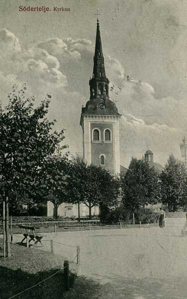 Sankta Ragnhilds kyrka. I förgrunden Turingelunden, även känd som "Brända tomten" av äldre Täljebor. Kvarteret mitt emot kyrkan förstördes i branden 1881 och kom aldrig att bebyggas igen. Även kyrkan eldhärjades och fick sitt nuvarande utseende efter den händelsen.