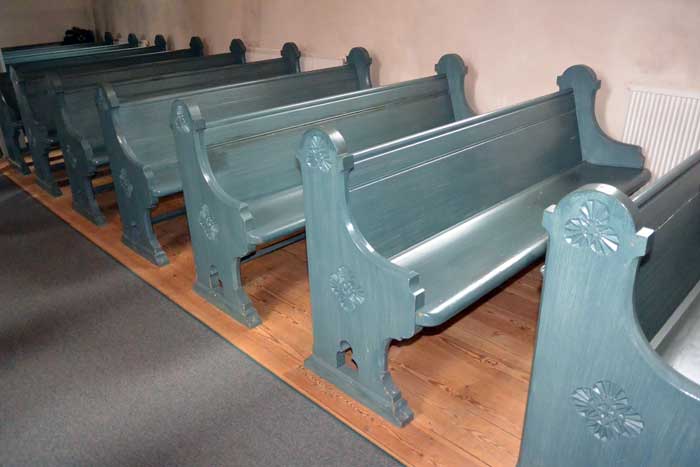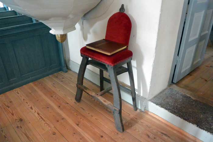 Den gamla klockarstolen som klockaren satt på när han ledde den gemensamma psalmsången. Då var den placerad under psalmtavlan.