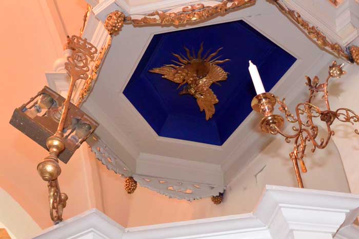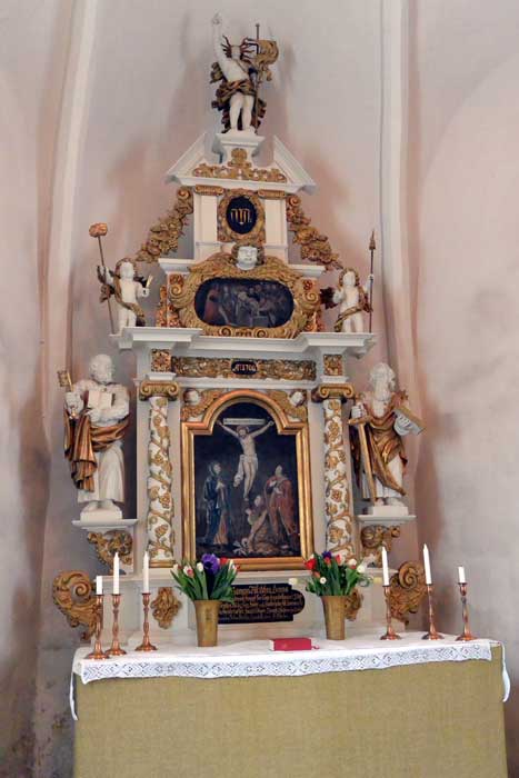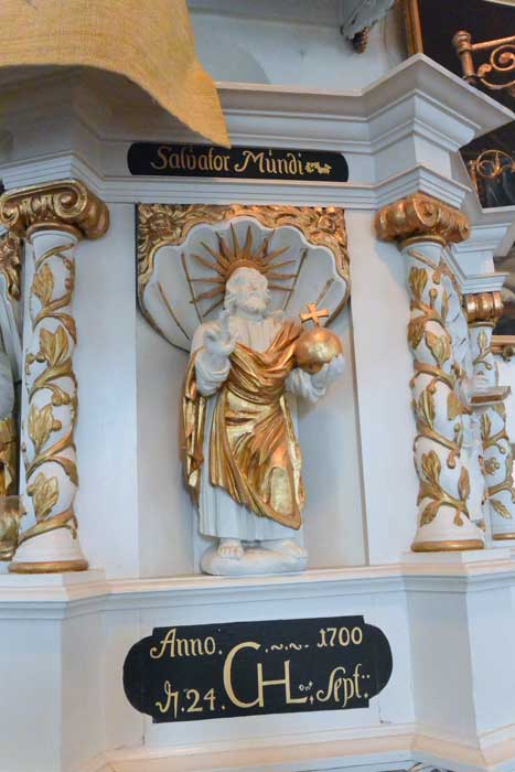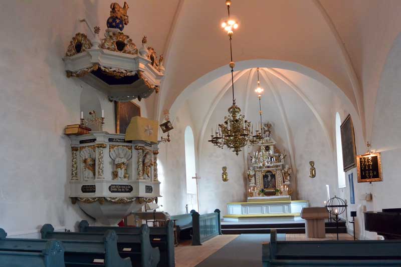 I skaristian hänger rester av det som återstår av det triumfkrucix som hängde i kyrkan före branden 1695.
