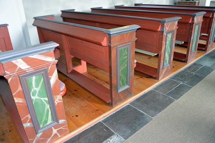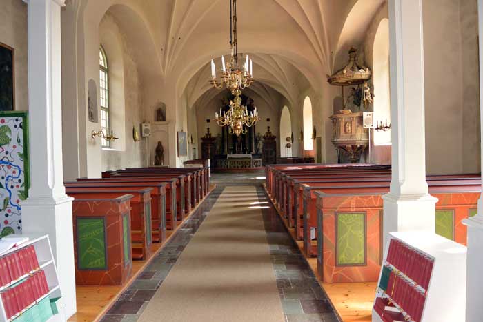 Altartavlan från 1690 tillskrivs skulptören Burchardt Precht. Gåva från herrskapen på Ludgonäs och Öster Malma.