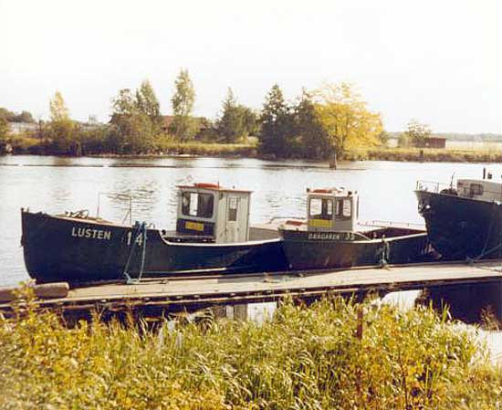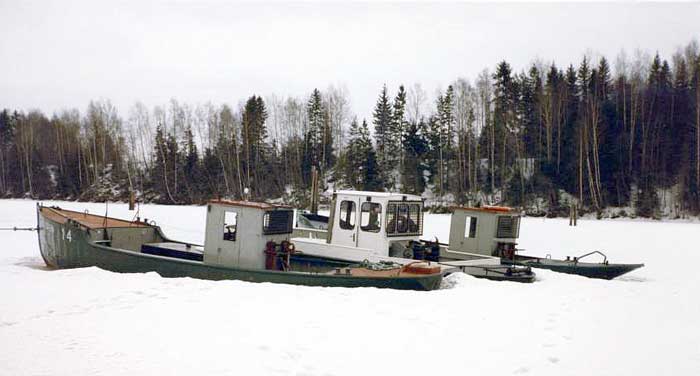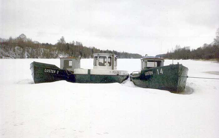 LUSTEN 2, PER-ERIK och LUSTEN 14 infrusna i isen utanför KFF:s verkstad i Dyvelsten, Forshaga - senvintern 1986
