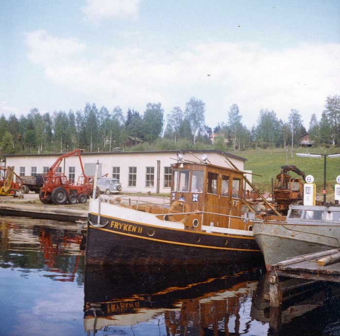 I förgrunden ses bogserbåtarna Fryken 2 och Fryken 3. Akter om båtarna skymtar flottningsföreningens egna bensin- och brännoljemackar från 1950-talet. Bränslet, som användes för såväl arbetsmaskiner, bilar och båtar, levererades via Nynäs Petroleum AB. Notera att Fryken 2 har reklam för detta, numera nedlagda, oljebolag på styrhytten. Strax bortom bensinmacken står en Fiat bandtraktor, försedd med hjulbandsutrustning av liknande konstruktion som Bolinder-Munktells välkända Bamse. Längre till vänster står en skogsutrustad Massey-Ferguson 65, med halvbandsutrustning och hydraulisk kran.