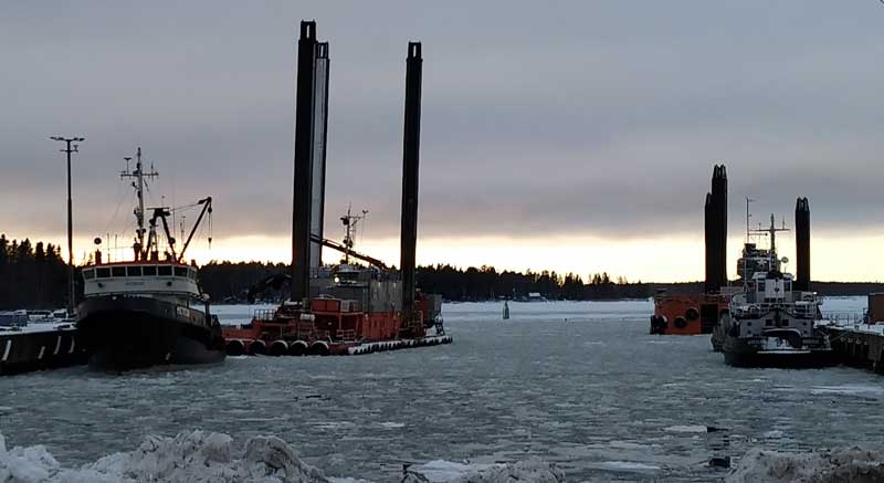 METEOR förhalar Wasa Dredgings mudderverk HARALD och OPTIMUS i Vasa hamn - Mars 2023