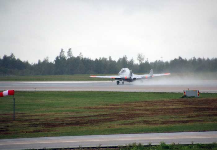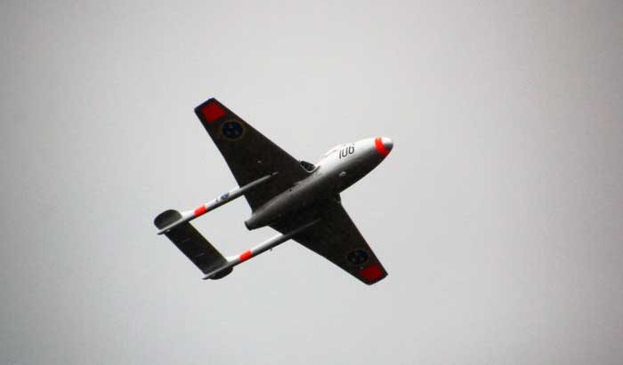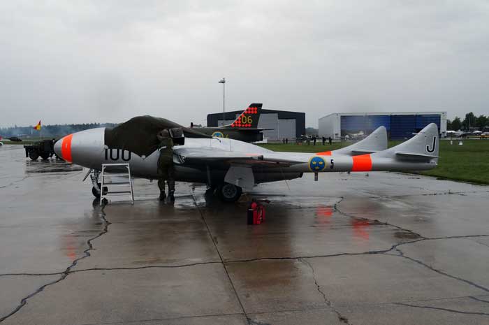 Alla flygvapnets J 28 Vampire skrotades, men ett antal flygande exemplar har kommit till Sverige från Schweiz. FDetta exemplar tillhör Nordic Warbirds.