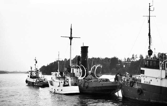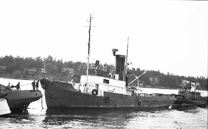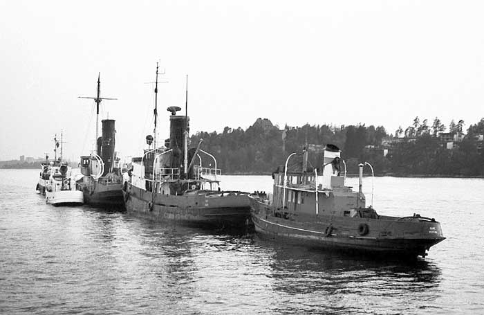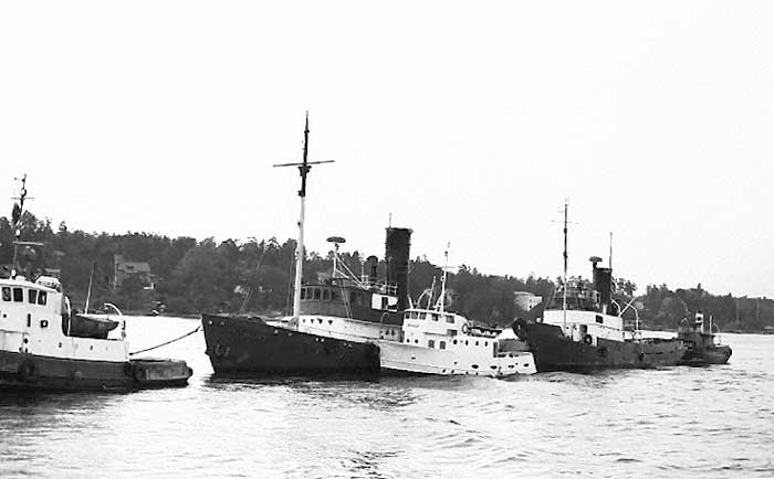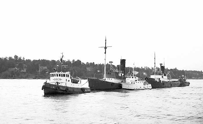 Oden med hjälp av Brage bogserar Balder, Aggö och Bore mot Ystad och skrotning. Bore blev köpt under resans gång och klarade sig från att skrotas.