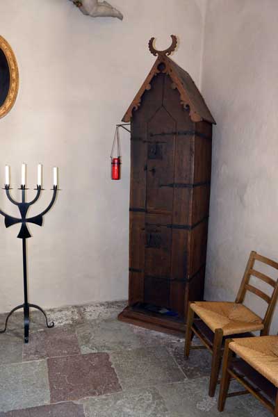 Mariabild från 1400-talet. Bredvid syns en bevarad dörr från ett numera försvunnet helgonskåp.