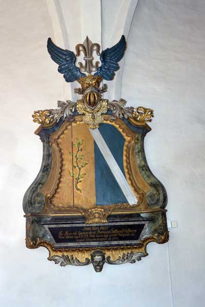 Detta begravningsvapen är till minne av lagmannen Johan von -Scheffer, död på Tisslinge 1748.