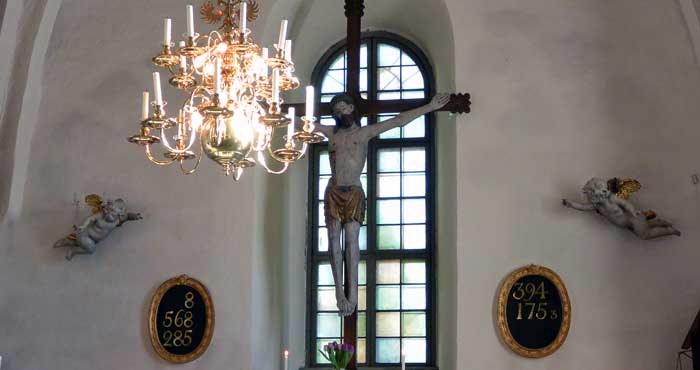 Triumfkrucifix som hänger över ingången till sakristian, daterat till 1300-talet och härrör troligtvis även det från den tidigare kyrkan.