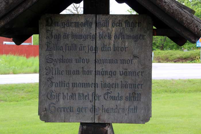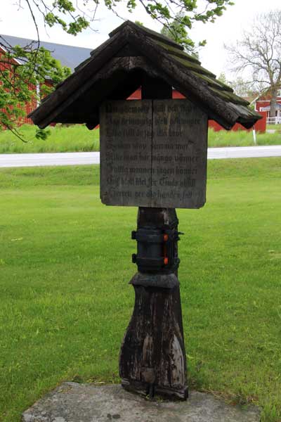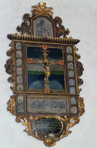 Epitafium från ca. 1600 gjort i östra Tyskland. Krucifixet har satt dit senare, det är ett processionskrucifix från 1300-talets mitt, tillverkat i Sverige.