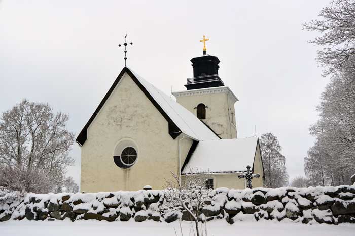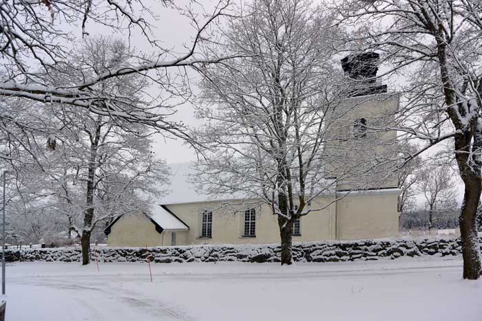 Övergrans kyrka klädd i snö. Under natten hade det kommit 15 cm. nysnö.