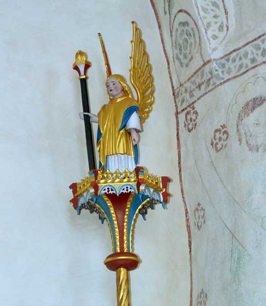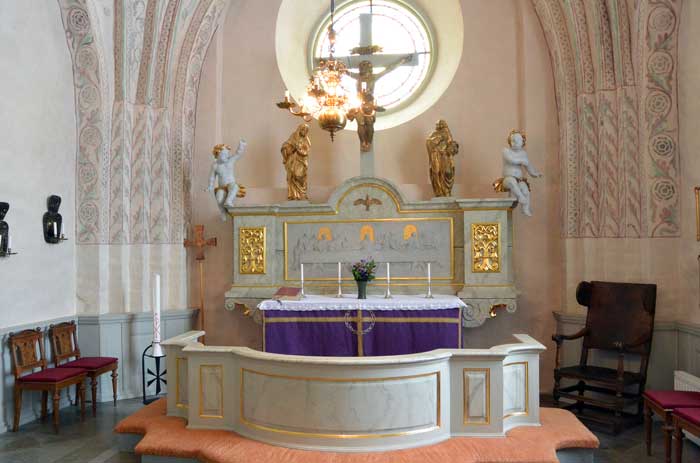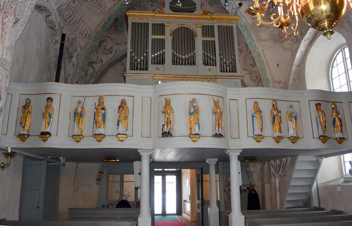 Figurerna som pryder orgelläktaren kommer från kyrkans förra altarskåp, ditsatta 1717 sedan altarskåpet från 1400-talets slut, hade kasserats året innan.