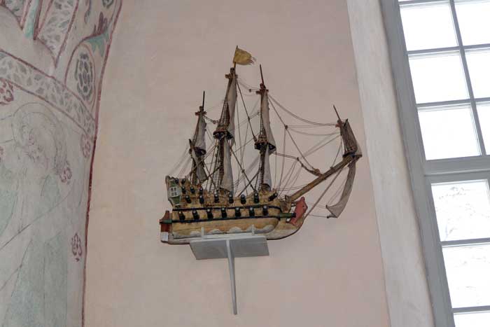 Trots att kyrkan inte är en kustkyrka så finns ett votivskepp. Ett fregattriggat örlogsskepp tillverkat i slutet av 1600-talet. Skänkt till kyrkan av fru Catharina Palmcrantz, Krägga gård.