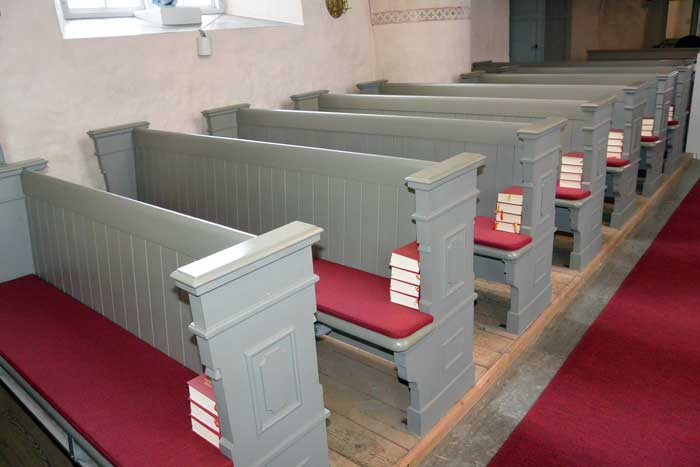 Bänkinredningen tillkom vid 1905 års renovering. Färgsättningen fick de 1972.