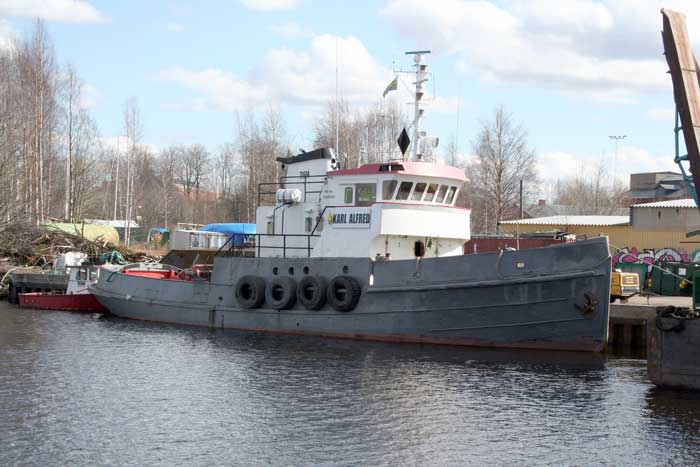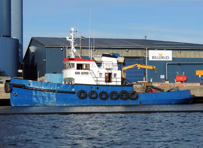 Byggdes för Rederi AB Transatlantic, Göteborg som MJÖRN och kostade 275 000 kr. Förvärvades för 130 000 kr den 1 april 1937 av Göteborgs Bogsering & Bärgnings AB och döptes om till DAN, ett namn hon fick behålla då hon 1946, för 250 000 kr överfördes till Malmö Bogserings AB, Malmö. Den 7 dec 1966 blev Statens Järnvägar nya ägare för endast 63 000 kr, namnet blev TRELLEBORG SJ och hemmahamn Trelleborg till 1972 då F:a Ringö Marin i Göteborg köpte och lät köpet gå vidare den 6 mars samma år för 75 000 kr till Urban Carlsson och Jan Nordell för under bildning varande Djurö Rederi AB, Stockholm. De byggde om båten ordentligt, satte tex på styrhytten från den danska färjan DAN och monterade in en motor samt ändrade namnet till RISSELÖ. Men det tog nog knäcken på dem, för i nov 1974 köptes båten för 600 000 kr på konkursauktion av Engström & Nilsson Maskin AB, Stockholm som generalagent för Caterpillar. Näste köpare blev Michael Sahlqvist, Göteborg som den 13 aug 1975 köpte för 425 000 kr, men han sålde igen i jan 1976, till Arne Avelins Bogserbåtar, Lidingö. I jan 1981 blev Wiréns Rederi AB, Piteå nya ägare för 900 000 kr, och de döpte om till PITSUND, men vid detta rederis konkurs 1986 köptes båten för 975 000 kr av JTS Sjöfarts AB, Smålandsstenar. De flyttade samma år till Varberg men båten såldes exekutivt vid Varbergs Tingsrätt den 7 sept 1989 för 580 000 kr till Jaakko Invest AB /Jaakko Kujariosti/, Malmö. Nästa gång båten såldes, 1991 till Scandoll i Malmö AB kostade hon 850 000 kr, men det hade sjunkit till 325 000 kr då Österströms Rederi AB, Valdemarsvik handlade 1993. Samma år utflaggades båten till företaget Procyon Ltd, Riga för samma 325 000 kr, men flaggan blev S:t Vincent & The Grenadines. Namnet ändrades då till MILZIS. Köptes till Gävle Bogsering & Sjöentreprenad AB, Gävle den 6 sept 2007 och omdöptes till KARL ALFRED. Överfördes 2011 till Tugab Construction AB, Gävle. Såldes 12 januari 2018 till T. Ekstrand Sjötjänst AB, Hallstavik, nytt namn KARL-ASTRID.