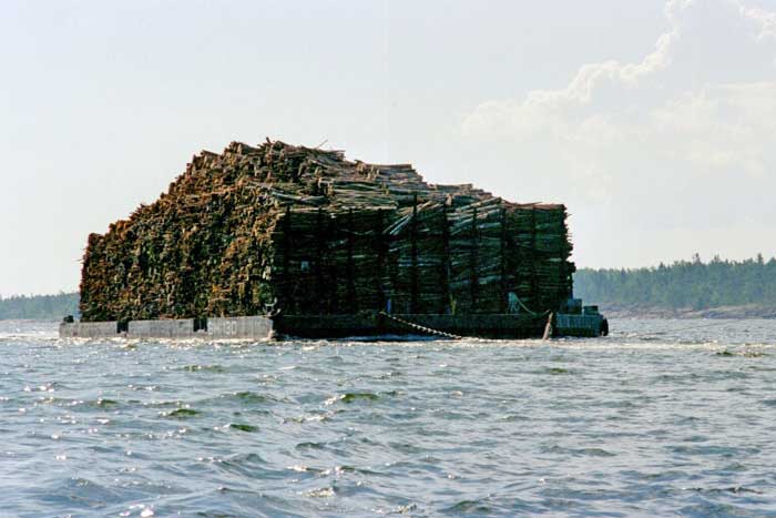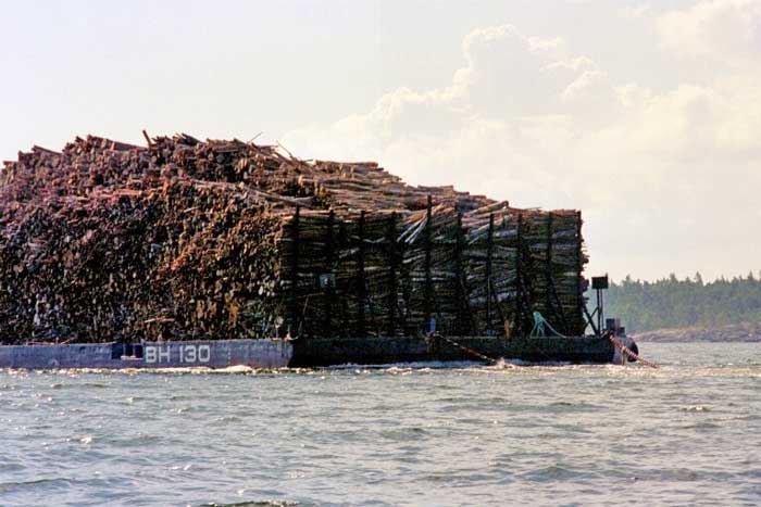 Pråmen är lastad med virke till Hallstavik.