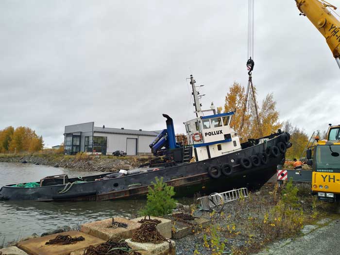 Byggdes som PLUTO för Interesentskabet A/S Ved Reberbanen och A/S Svitzers Bjergnings-Entreprise, Köpenhamn. Köptes den 22 juni 1981 till Oy Hangon Hinaus AB, Hangö. Historien därefter lika de andra HH-bogserarna till den 1 dec 1988 då hon förvärvades av Alfons Håkans Oy AB, Åbo och döptes om till POLLUX. Såld ca 1993 till Kalajoen Huolinta, Rahja senare Rahjan Houlinta Oy, Samma ort. Såldes i april 2001 till Rannikon Metalli Oy, Vasa och i nov samma år till Kallan Matkailu Oy, Vasa.