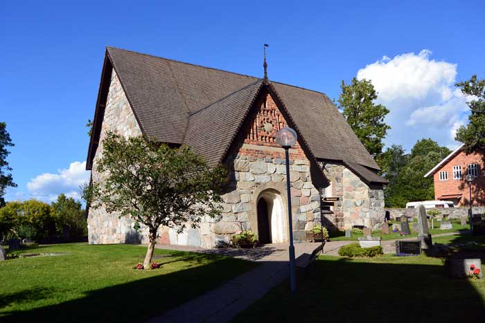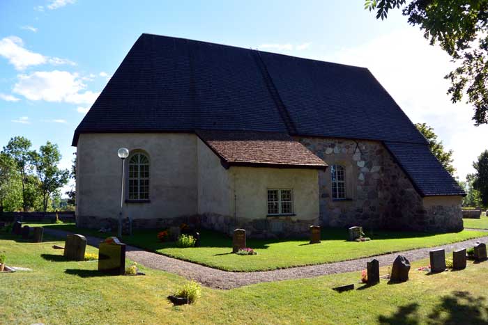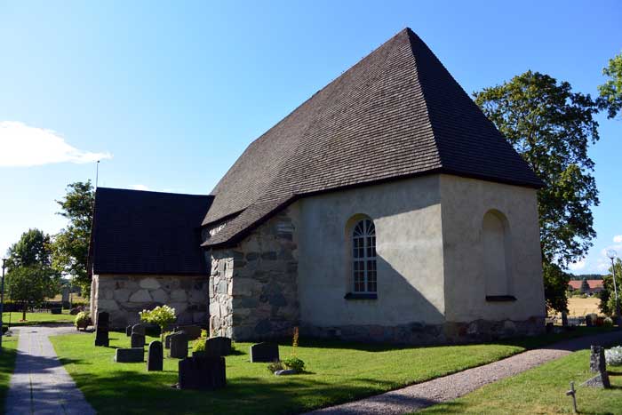 Från 1200-talets senare hälft. Troligen ersatte den en tidigare kyrka eller kapell i trä. Kyrkan skadades svårt i en eldsvåda på 1600-talet. Därefter tillkom de massiva stävpelarna i nordvästra och sydöstra hörnet. Under 1600- och 1700-talet förföll kyrkan så pass att det började bli farligt att vistas inne i kyrkan. 1745 erbjöd sig Erik Mattias von Nolcken på Ticksta att ersätta den lutande östgavel med ett kor mot att han fick en gravplats inne i kyrkan.