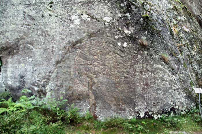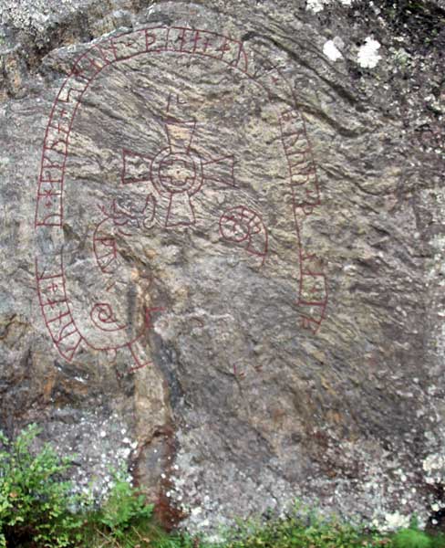 Runristning funnen 1964. Nedredelen är söndervittrad, vilket har skadat textens början och slut.