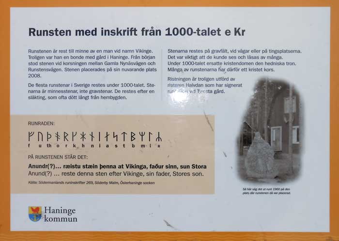 Står numera utanför Kulturhuset i Haninge. Stenen har flyttats från sin tidigare plats i vad som då hette Söderby villasamhälle. Stenen restes upp 1925, efter att ha legat kullfallen där länge. 2008 flyttades den till nuvarande plats.