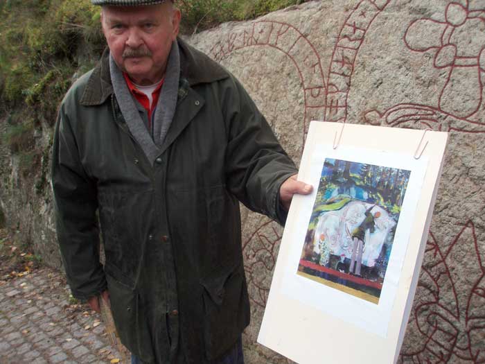 Lars visar upp ett av Sven "X:et" Erixons verk med Holmfaststenen som motiv