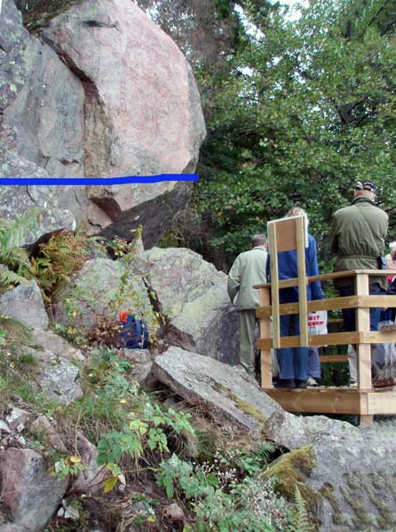Den blå linjen visar ungefär var vattennivån stod när runorna ristades, vilket var ca. 5 meter över dagens nivå på Mälaren.