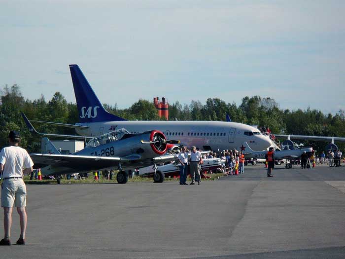 Flygplanet närmast är en Noorduyn AT-16 Harvard II B (TA-268) och bakom står SAS Boeing 737