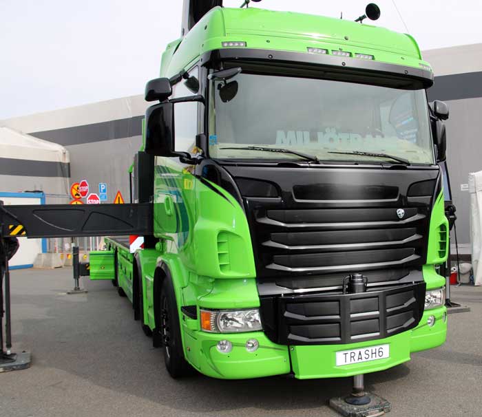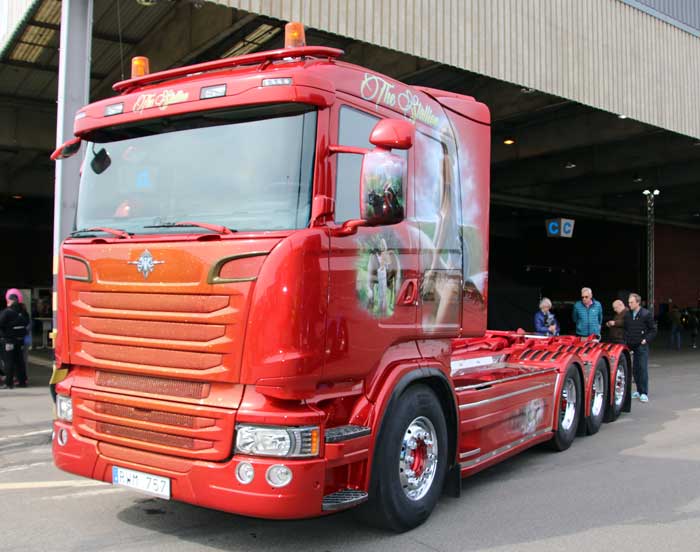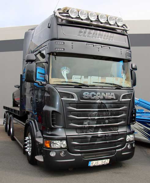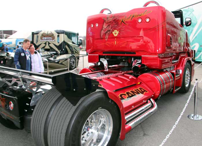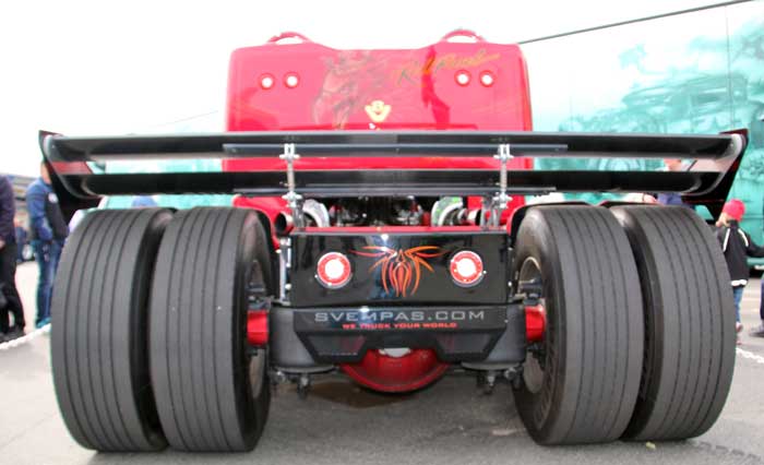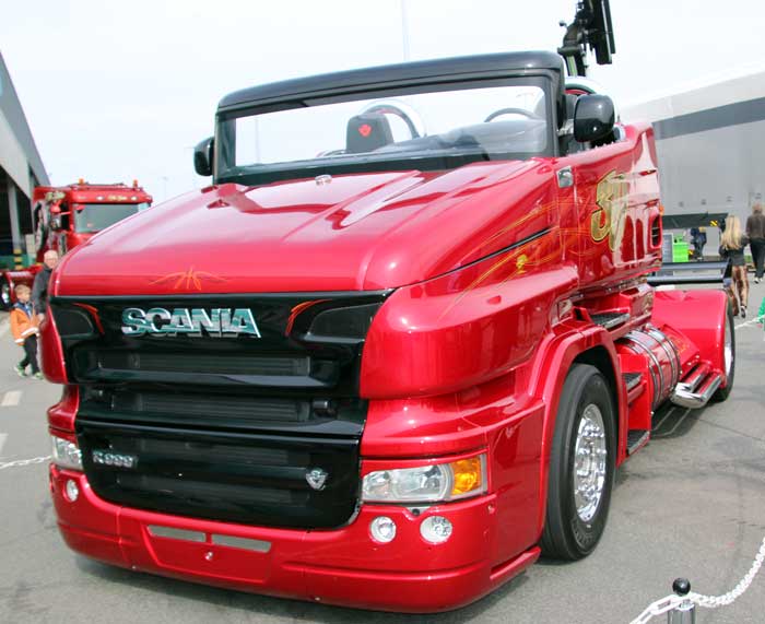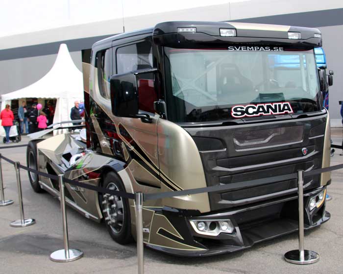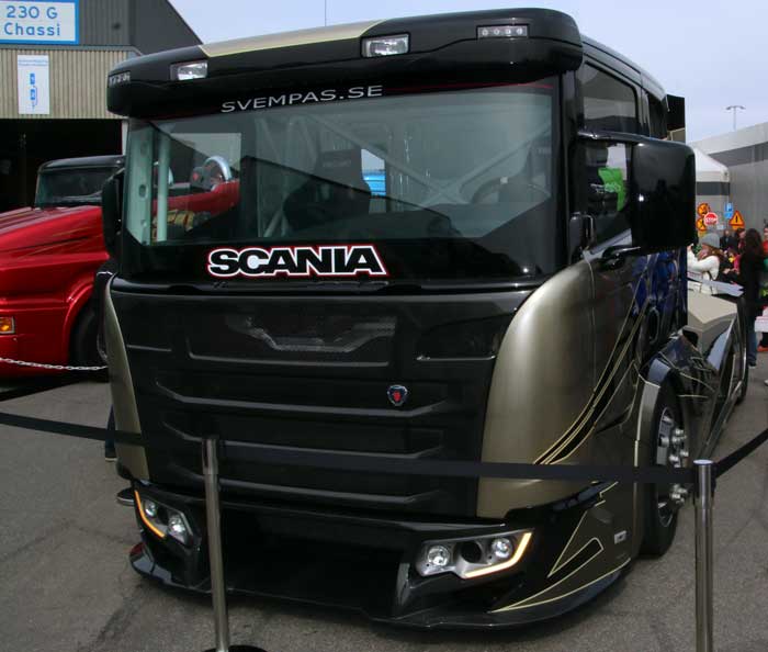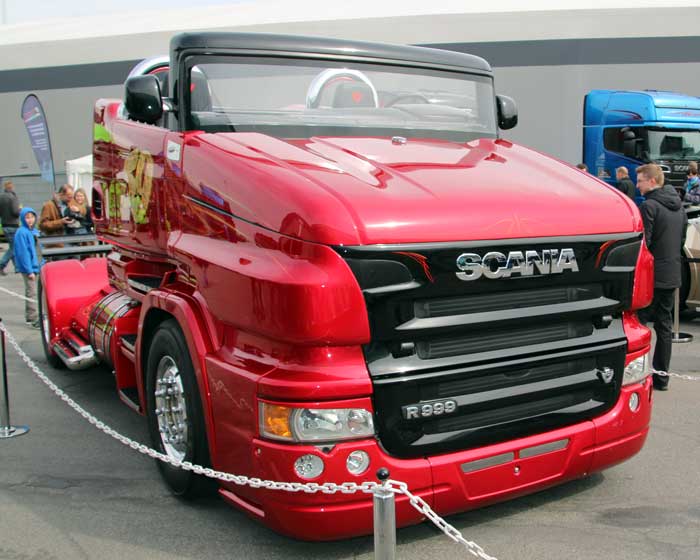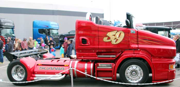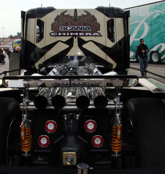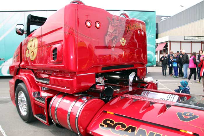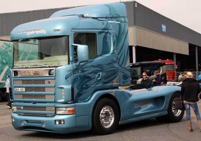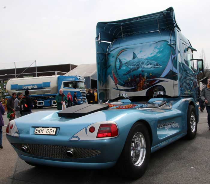 Showtruck från Svempa - Scania roadster (från början en T500). 999 hk 16 liters V8 (marinmotor). 30-100 på 5 sek., toppfart 210 km/t. Design Jan Richter