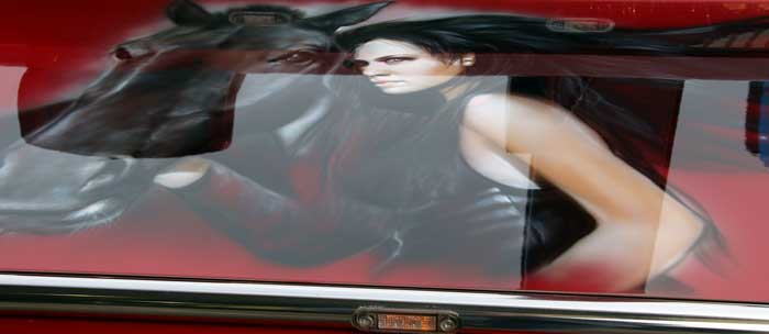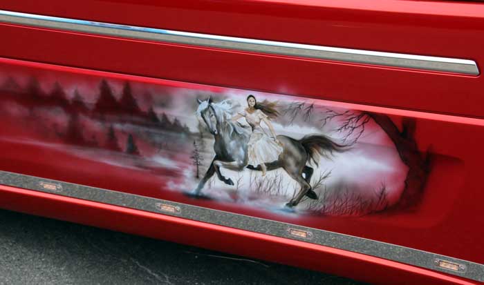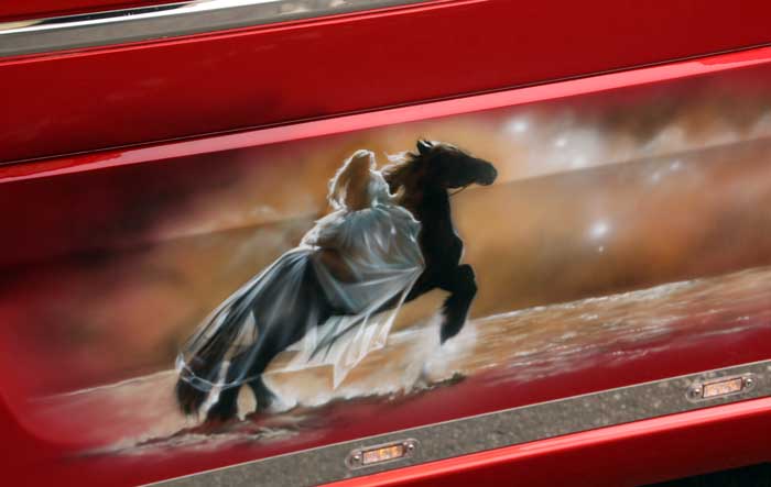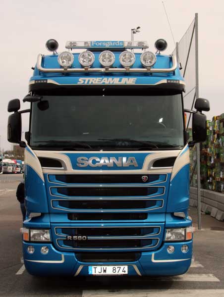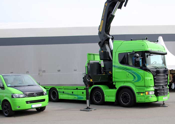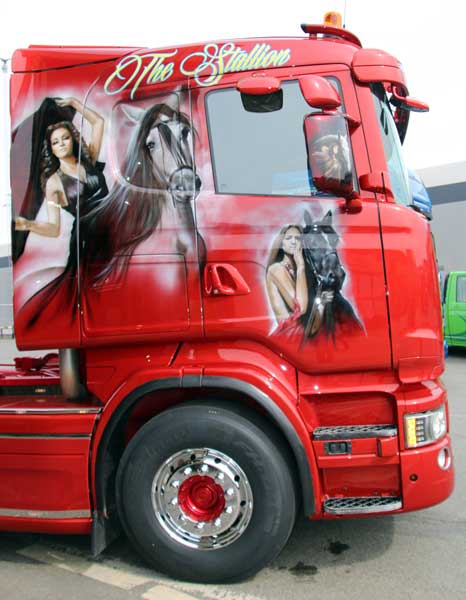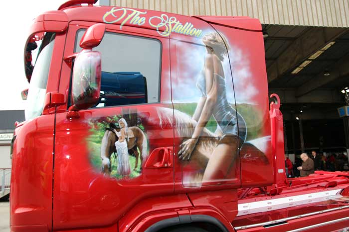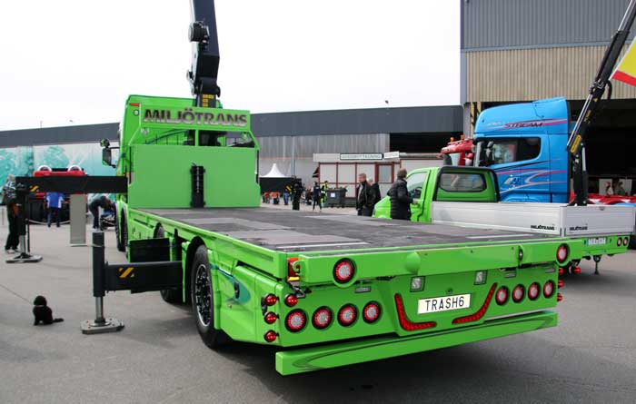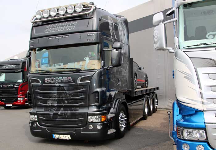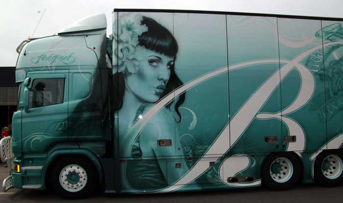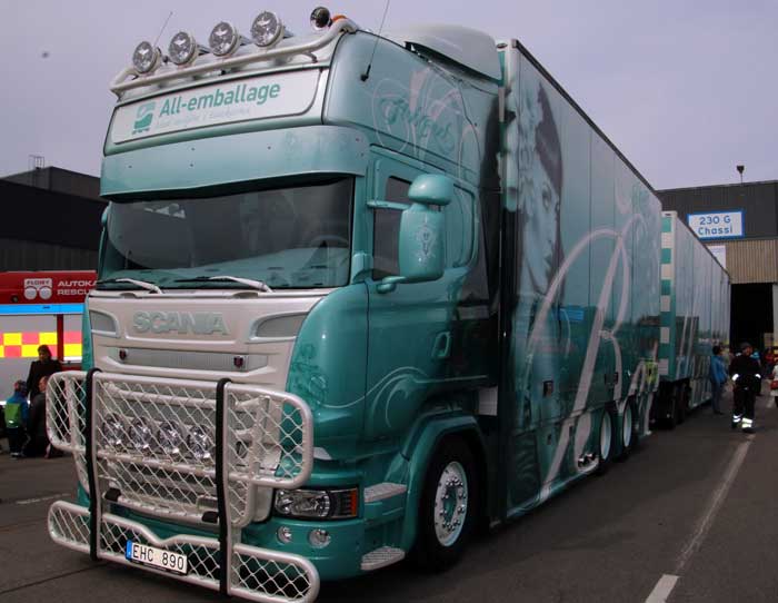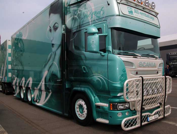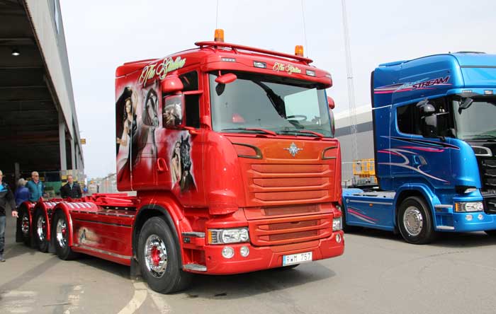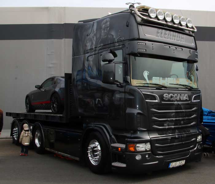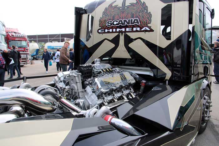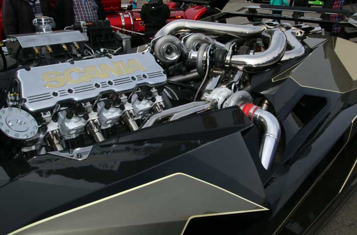 Showtruck från Svempa - Scania roadster (från början en T500). 999 hk 16 liters V8 (marinmotor). 30-100 på 5 sek., toppfart 210 km/t. Design Jan Richter