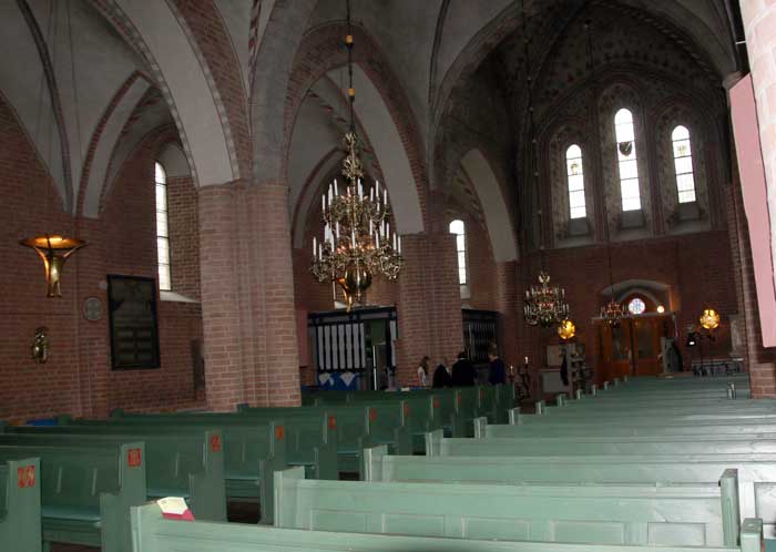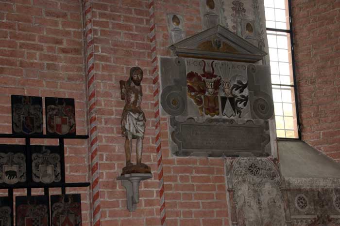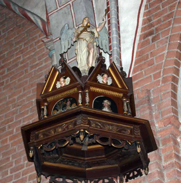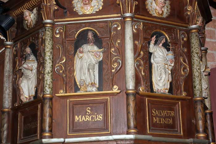 Predikstolen är från 1647 med Jesus som världens frälsare omgiven av de fyra evangelisterna samt aposteln Paulus.
