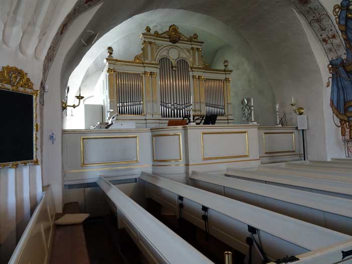 Predikstolen är från 1740, liksom draperimålningen bakom.