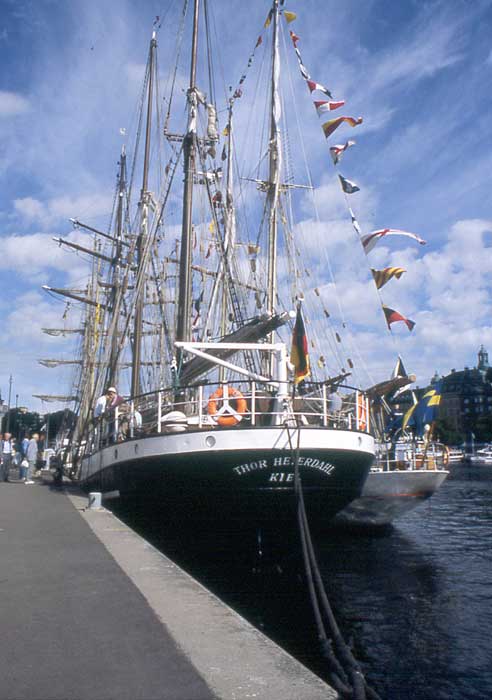 Ytterst ligger svenska skonaren FALKEN och innerst ligger tyska THOR HEYERDAHL