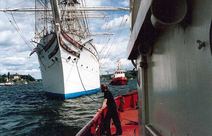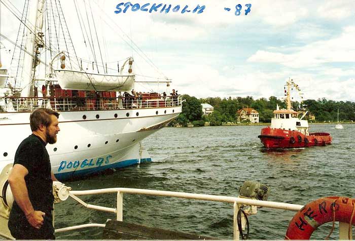 Den norska barken STATSRAAD LEHMENKUHL bogseras till Djurgården med HERO och TEBE - 1987