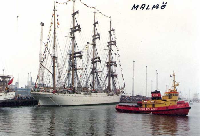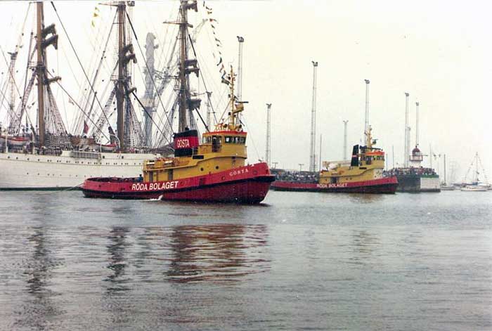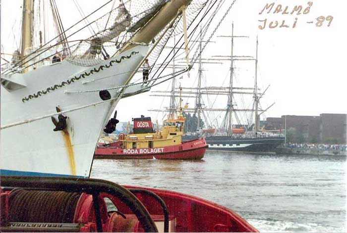 SUNDET på väg till Göteborg från uppdrag i Kalmarsund tillsammans med FÄRDIG stannade till i Malmö för att hjälpa till vid segelfartygens avgång. Bogserbåten i bild är GÖSTA.