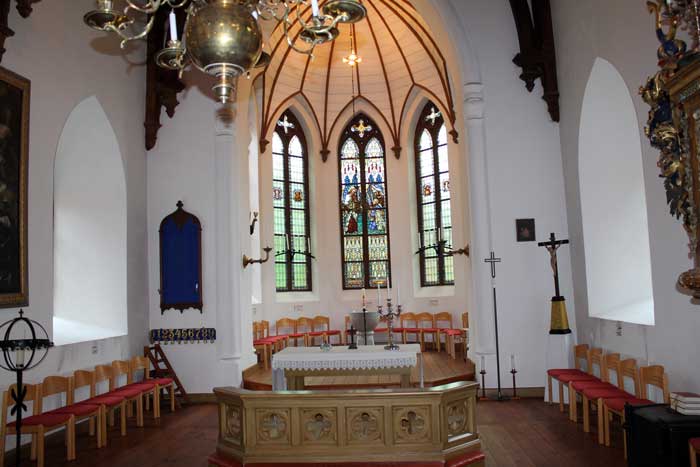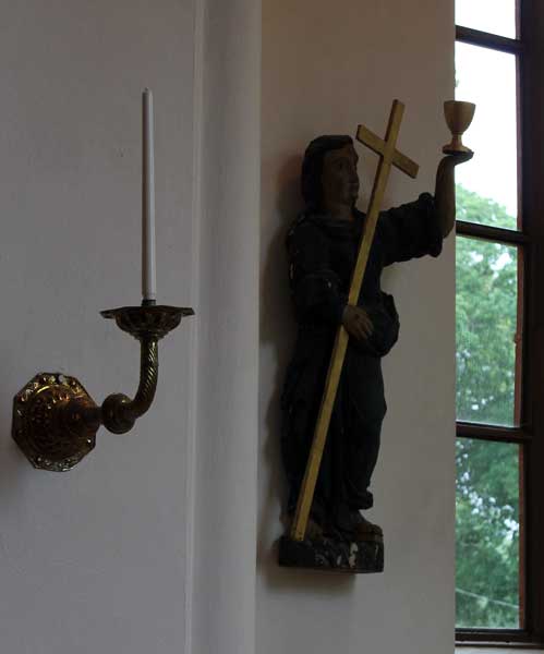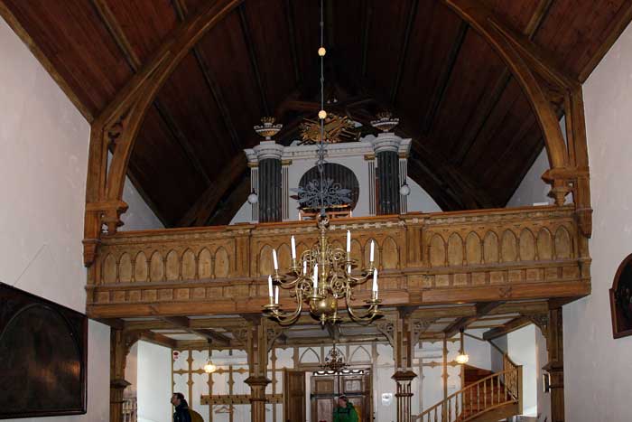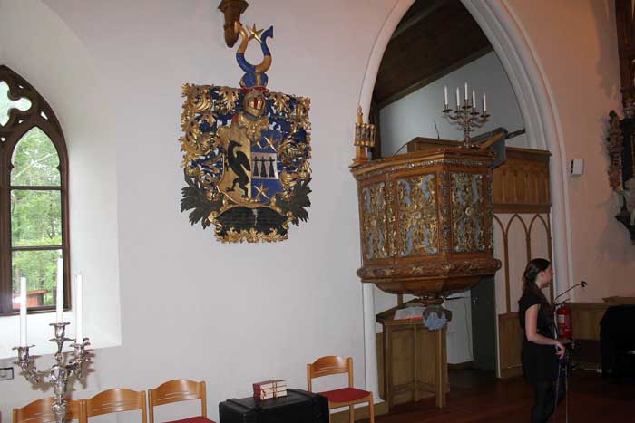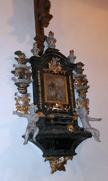 Predikstolen tillverkad av Anders Heisig, skänkt av Johan von Westphal (ca 1701) vars epitafium hänger bredvid.