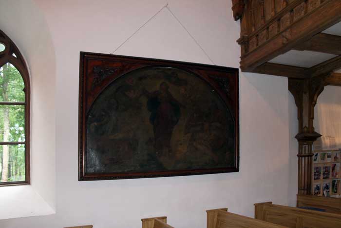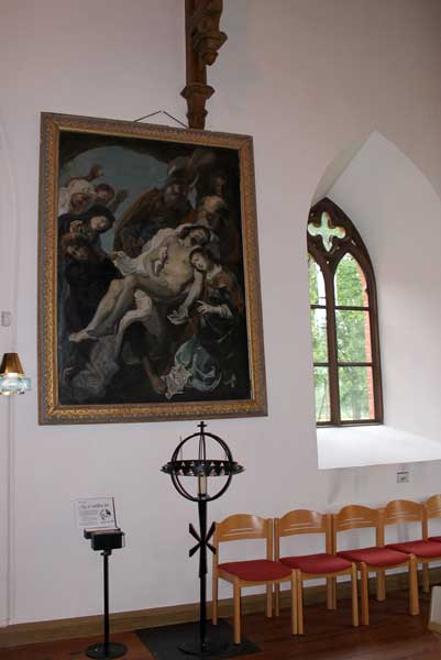En äldre altartavla som föreställer Nedtagandet från korset. Troligen en kopia efter Jakob Jordaens (1593-1678). Originalet antas ha tillhört en svit på 12 tavlor som Karl X Gustaf beställde och som senare förstördes när Stockholms slott brann år 1697. Tavlan hade ursprungligen ett stort ramverk, varav endast nedanstående två figurer återstår