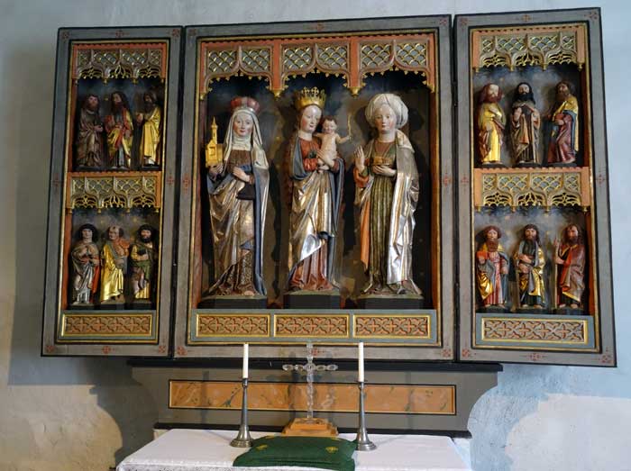 Altarskåp från 1400-talets sista kvartal. Ursprngligen från Schlesien i östra Tyskland. Skänktes till kyrkan av Magnus Gabriel de la Gardie. Låg under många år i klockstapeln innan det återinsattes i kyrkan 1949. Gamla altartavlan finns i sakristian (se längre ner).