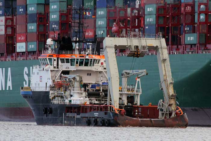 UNION MANTA med det grundstötta containerfartyget CSCL INDIAN OCEAN som den 4 februari drabbades av "Black out" på floden Elbe, med grundstötning som följd. Sammanlagt tio bogserbåtar deltog i flottdragningen, varav två bjässar.