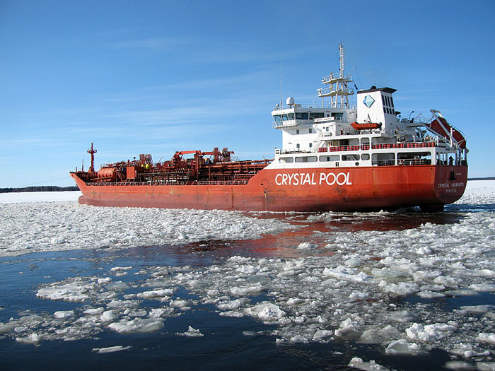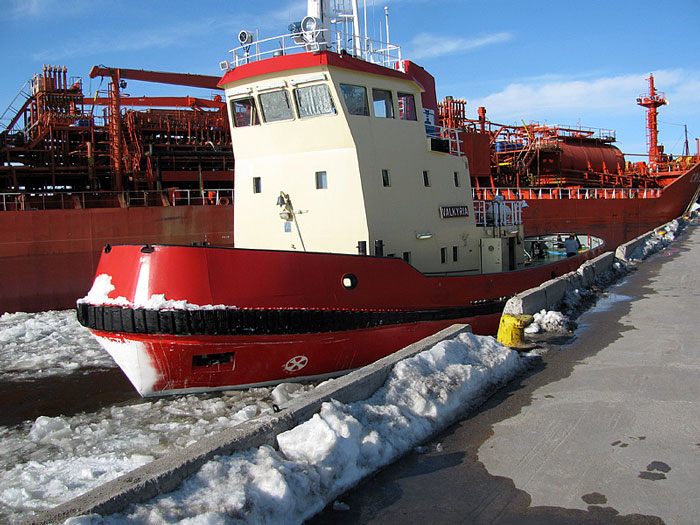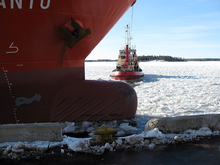 CRYSTAL AMARANTO på väg in till Karlsborg efter att ha fastnat i rännan en bit utanför. CRYSTAL AMARANTO är något bredare än de fartyg som normalt trafikerar här så rännan var för smal. VISCARIA och VALKYRIA fick hjälpas åt att bredda rännan.