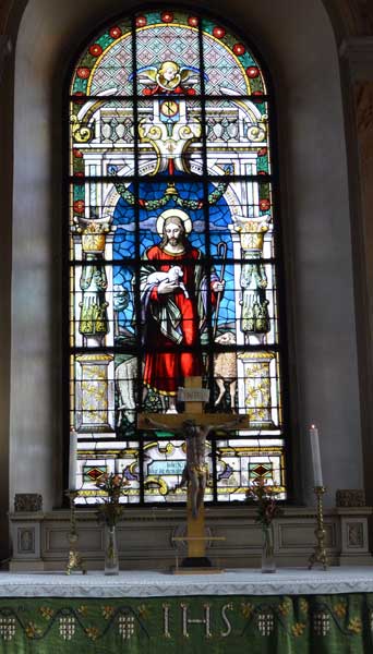 Altartavla utgör detta fina korfönster som föreställer Den gode herden.